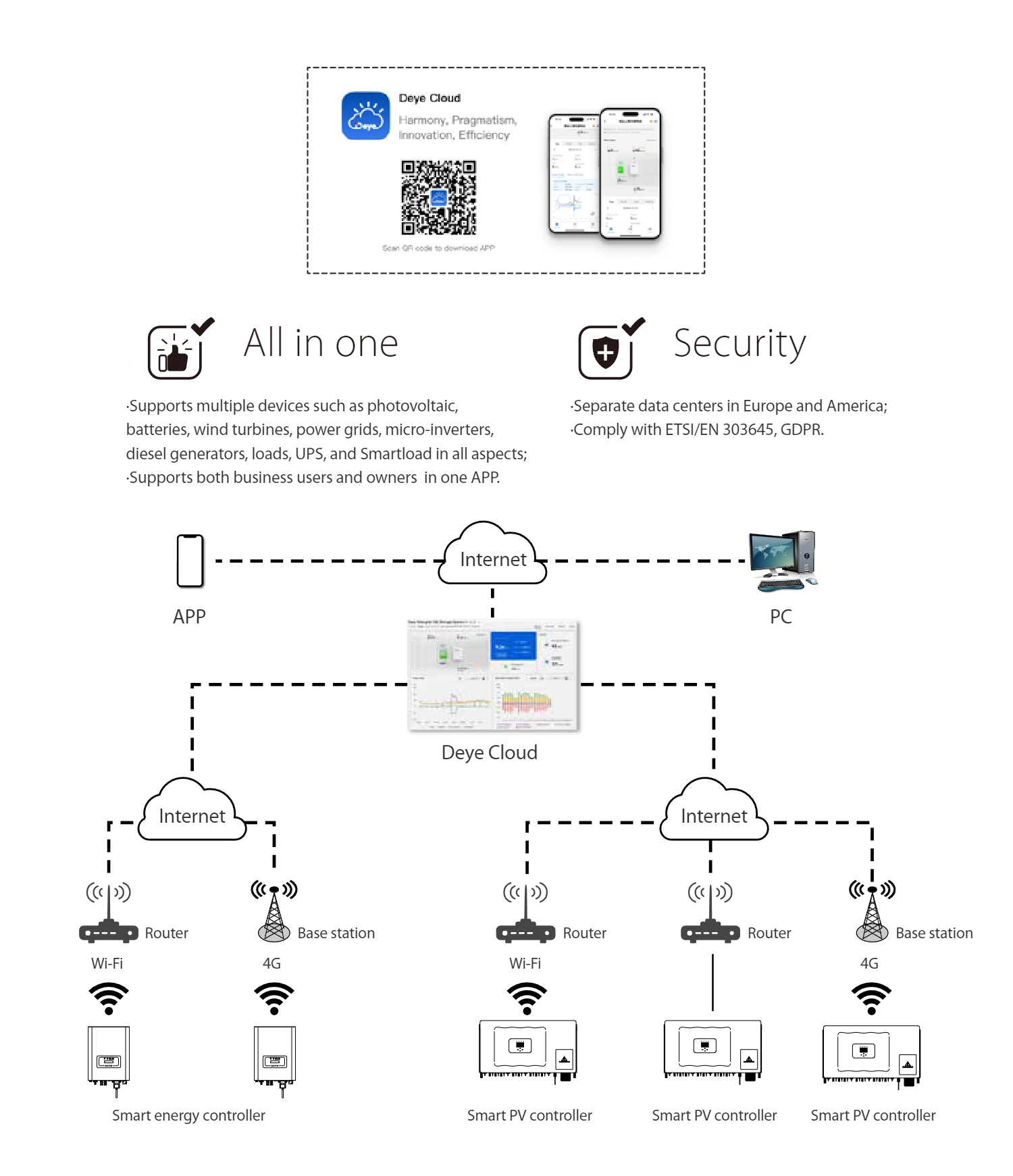 La plate-forme de Big Data Deye Smart Cloud permet une gestion transparente de tous les types de centrales, améliorant leur valeur. Il offre une variété de types de centrales électriques et d'équipements, une surveillance complète, un dépannage efficace, des données intelligentes Analyse, visualisation du flux d'énergie et modes de gestion divers.